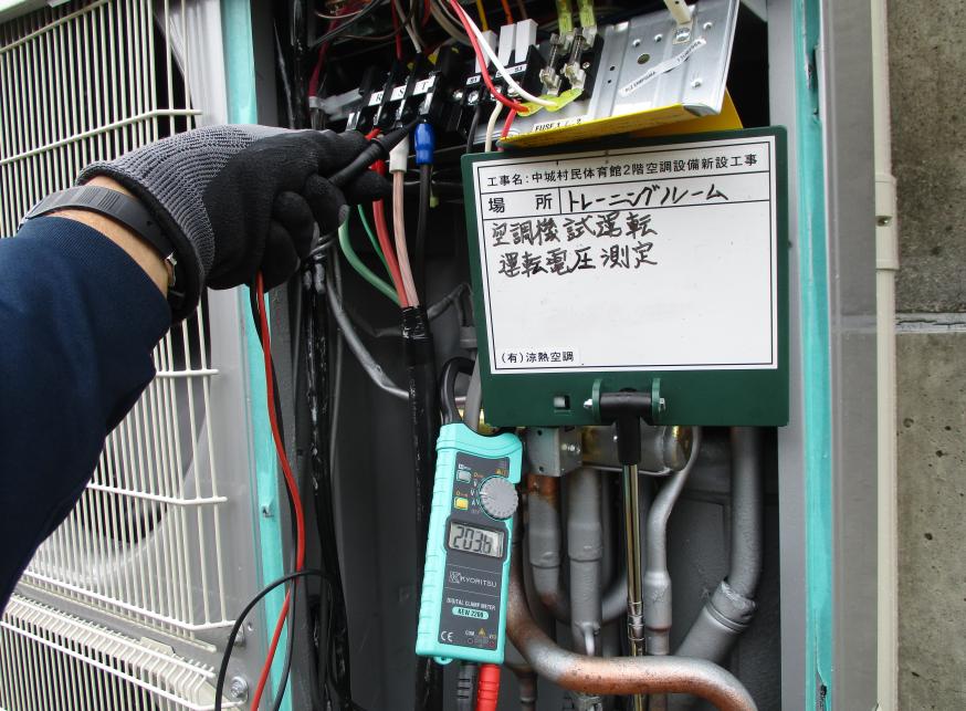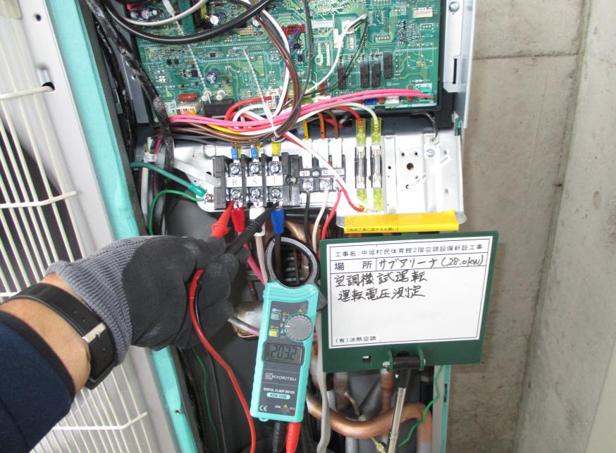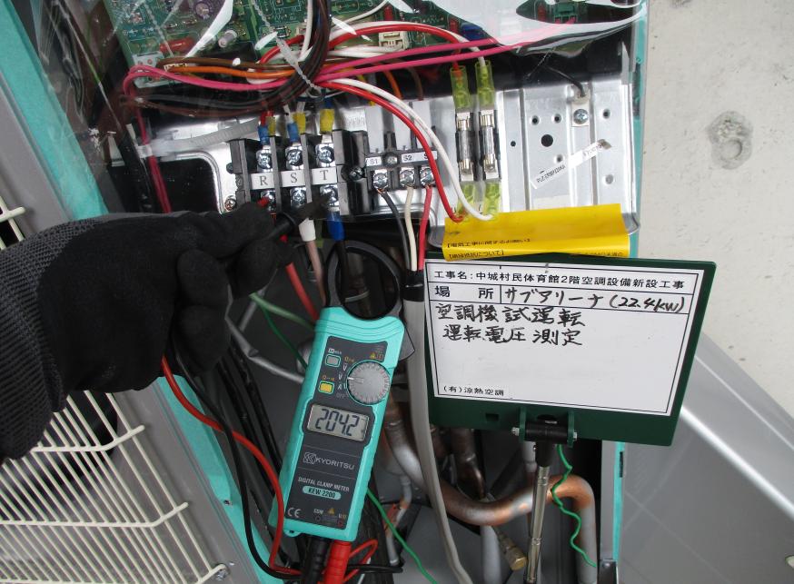 冷房能力28.0kw 試運転調整 電源電圧測定状況